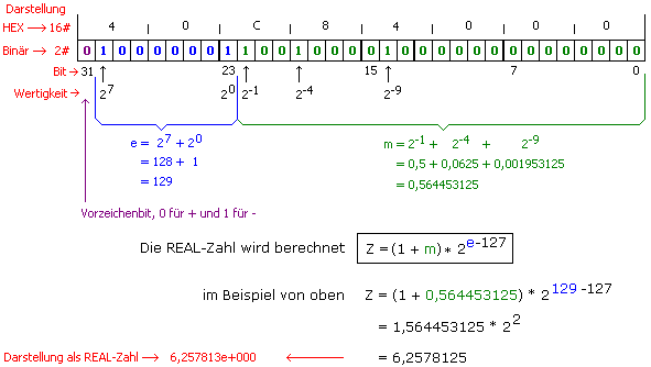 Gleitpunktzahlen (REAL-Zahlen) wird der Datentyp REAL (32-Bit Gleitkomma-Zahl) verwendet. Sein Wertebereich geht von ±1.18 *10-38 bis ±3.40 *1038. Beispiel eines Bitmusters im Speicher und daraus der interpretierter Wert beim Datentyp REAL.